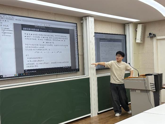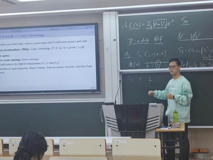 随后,华东师范大学数学科学学院2024级拔尖班的肖倍达同学作了题为“Kazhdan-Lusztig Deligne-Lusztig: Geometry Meets Representation Theory”的报告。报告介绍了群和代数表示论中的Kazhdan-Lusztig和Deligne-Lusztig理论,阐述了两种理论如何分别从李代数表示和有限李型群表示的角度利用代数几何的语言来研究表示论的问题。