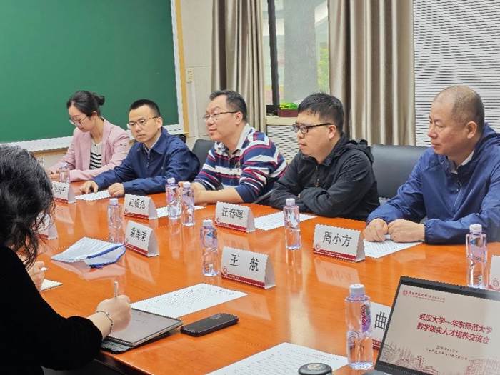 在学生报告的同时,两院教师团队也围绕拔尖人才培养展开了交流。武汉大学数学与统计学院副院长吕锡亮,骨干教师汪春晖、张晓平、周小方及学工办团委书记廖蕾蕾,华东师范大学数学科学学院副院长袁海荣,院长助理朱萌和拔尖班班主任王航、晋海波参加了研讨。双方就专业基础课程教学、拔尖班教材编写、高水平科研训练、拔尖学生选拔和拔尖班动态调整、培养方案制定、学生个性化发展等问题展开了深入讨论,加深了对拔尖人才培养规律的认识,也为后续完善拔尖人才培养体系提供了支持。
